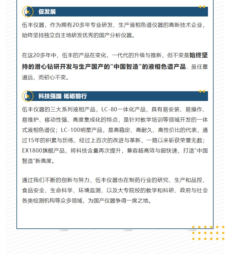 ? ? 伍豐儀器,不忘初心。始終致力于研發與生產國產液相色譜系列產品,努力打造“中國智造”新標桿,實現國產替代,助力中國自主科技騰飛。?